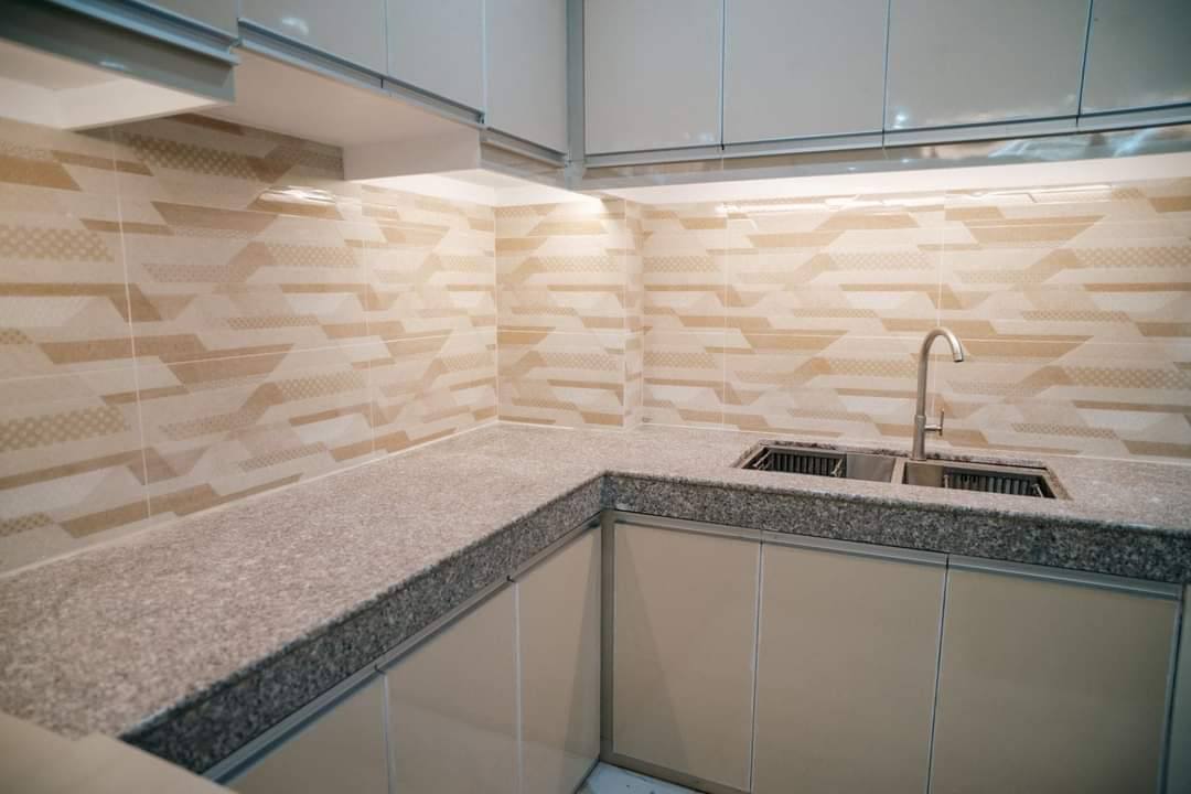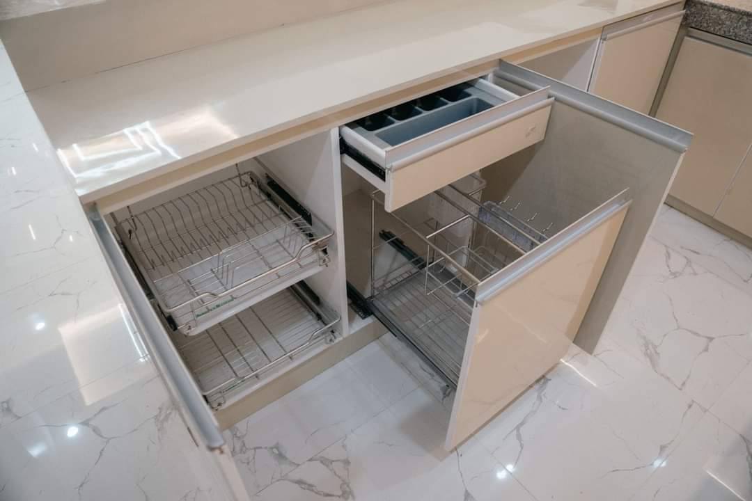*Built-In Cabinets Marine Plyboard with Gloss Laminates and Gloss Paint and 5 Kitchen Pull-out for Plates, Pans, Spices, Sauces, Knife and Board, Cups, Bowls, and other Kitchen Utensils and Spoon/Fork/Knives.